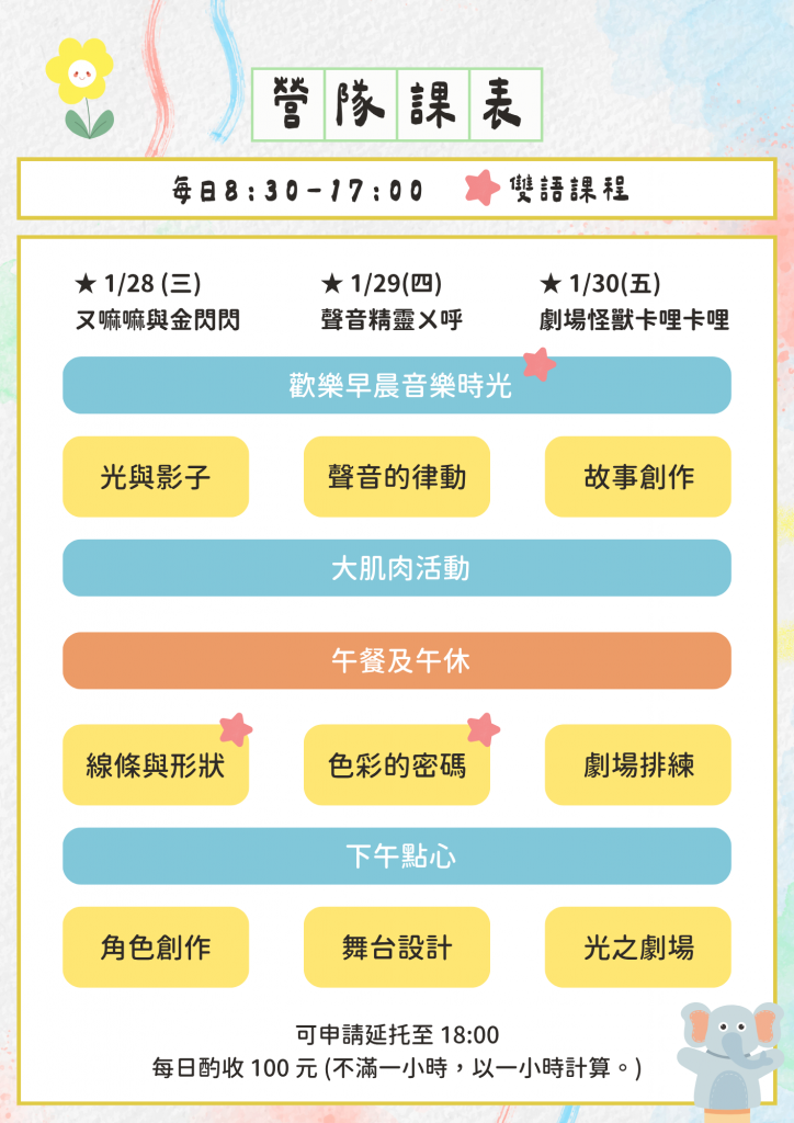 延托說明|17:00–18:00 開放延托,每日加收 100 元;不足一小時以一小時計算。