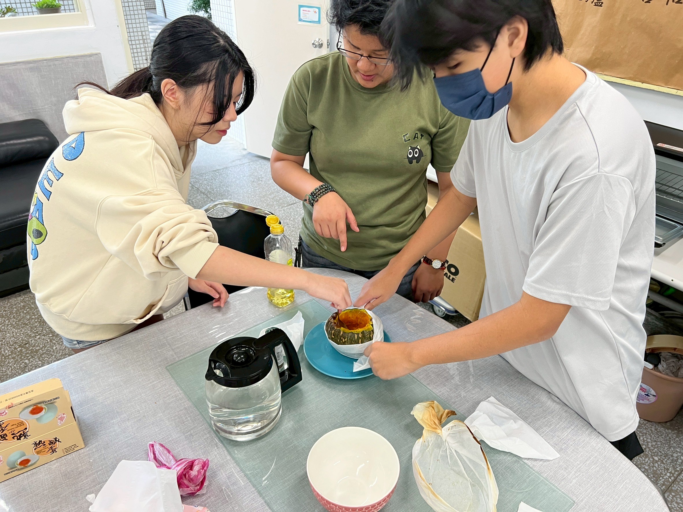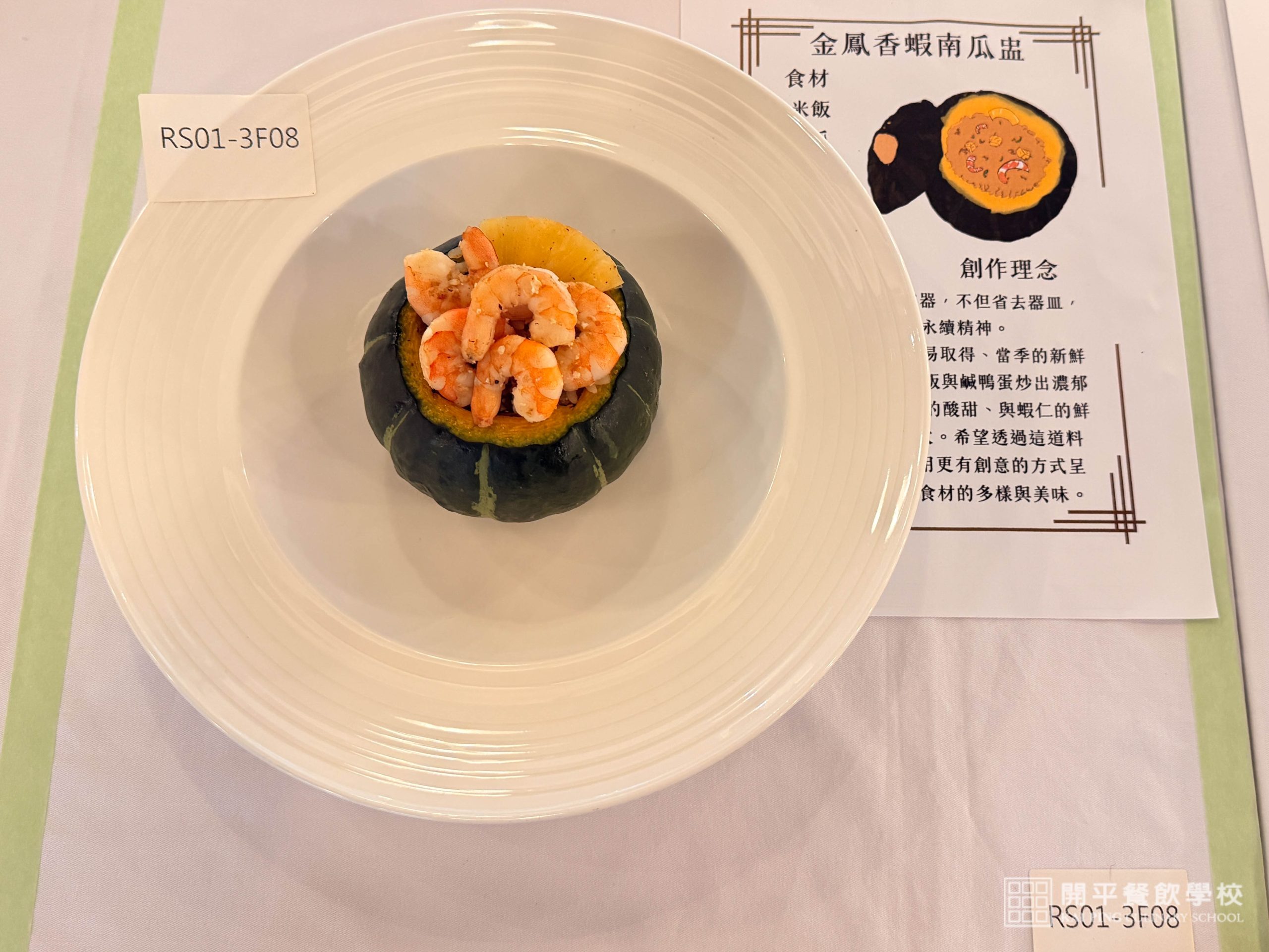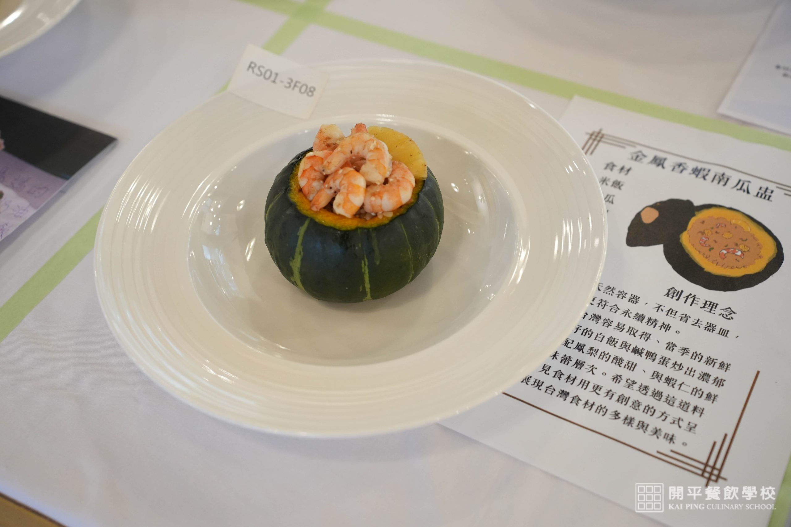 從這次的主題「台灣特色米食料理」發想,大家一起集思廣益、練習與修正,最終呈現出「金鳳香蝦南瓜盅」這道特別又美味的料理!