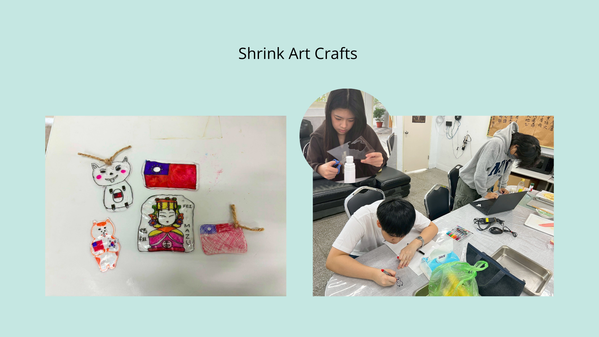 Cultural Art Crafts:大家討論後決定加入手作元素,製作熱縮片吊飾,我們做了自己喜歡的角色、台灣國旗、媽祖圖像等。
