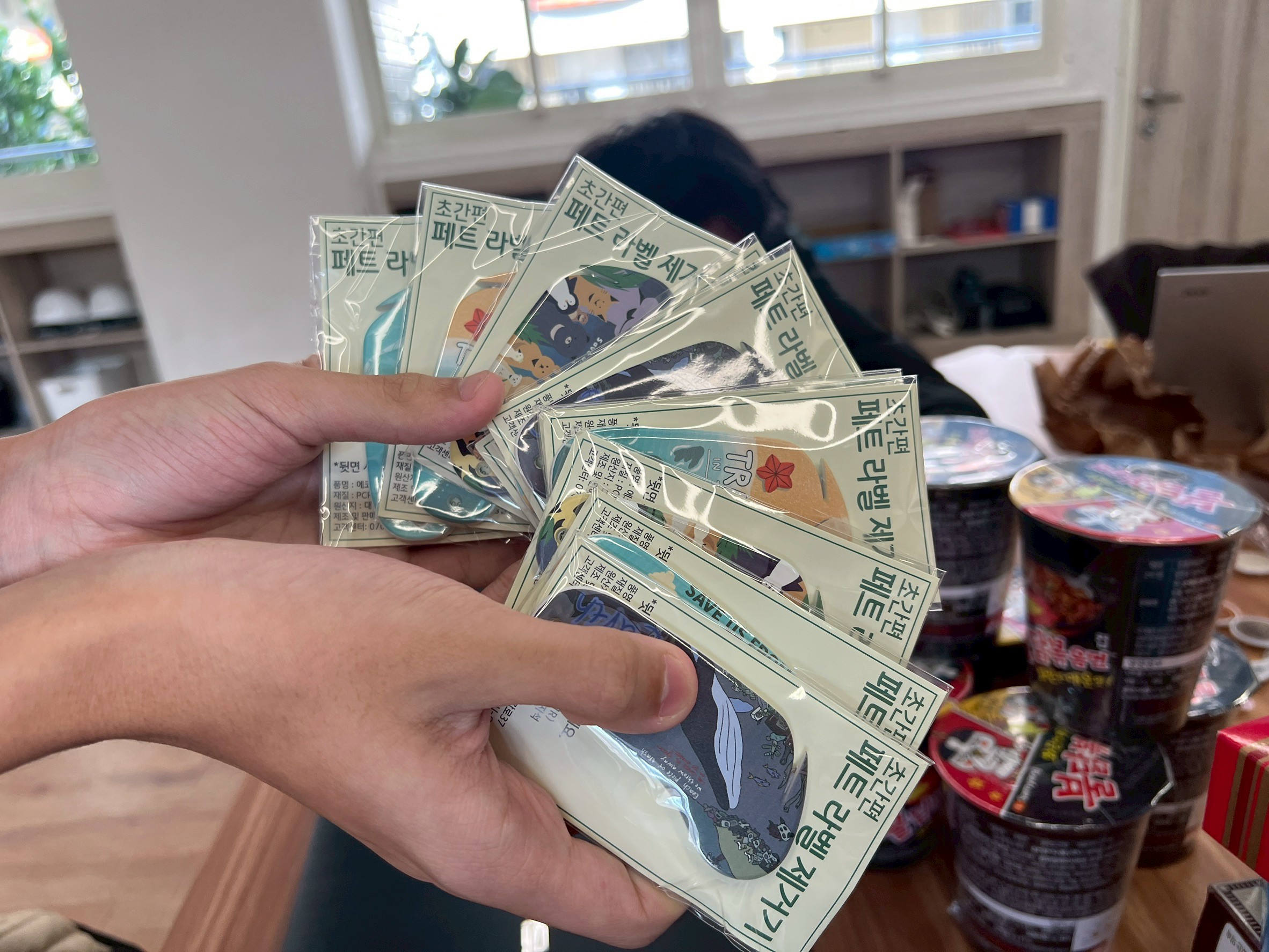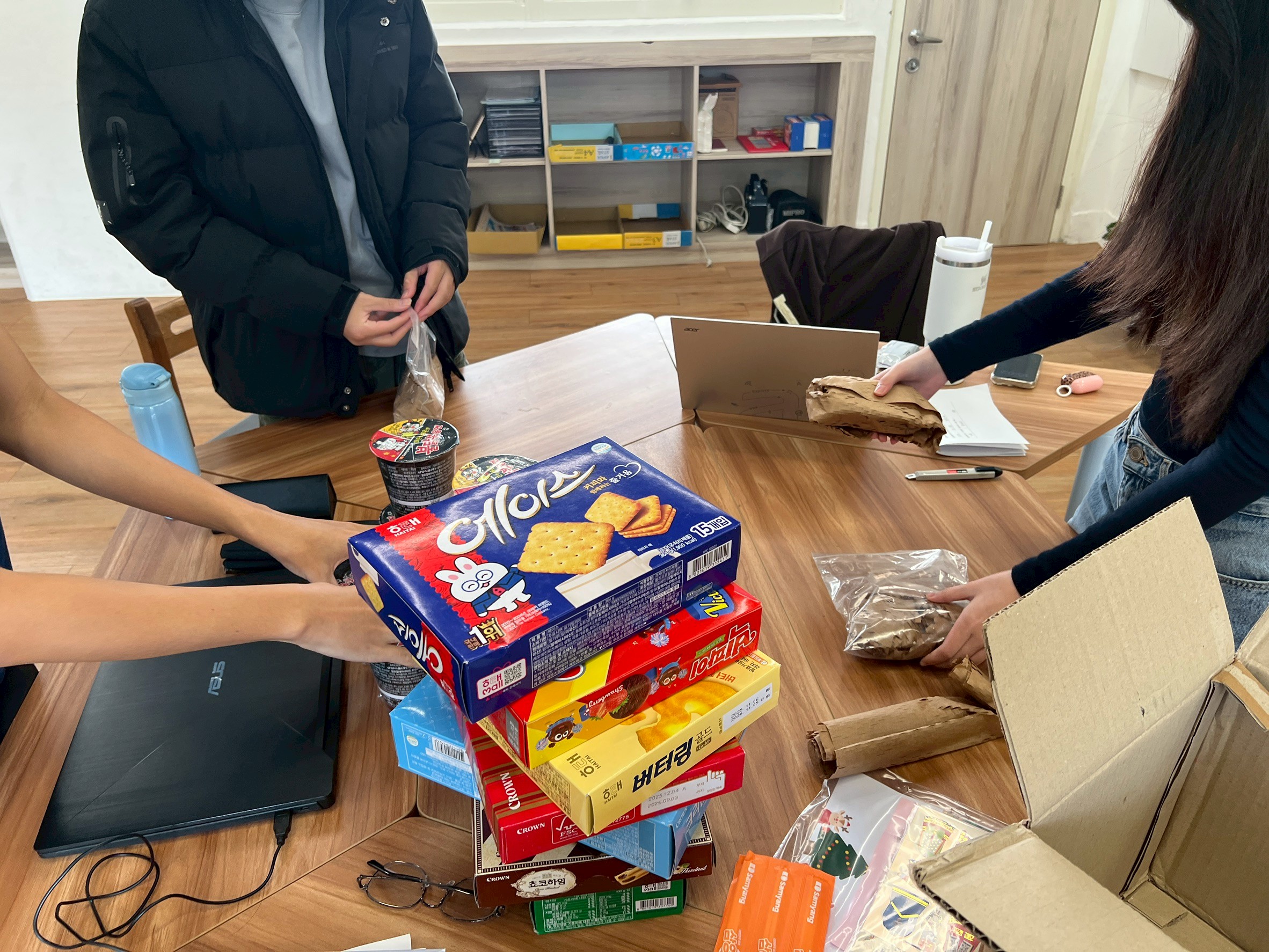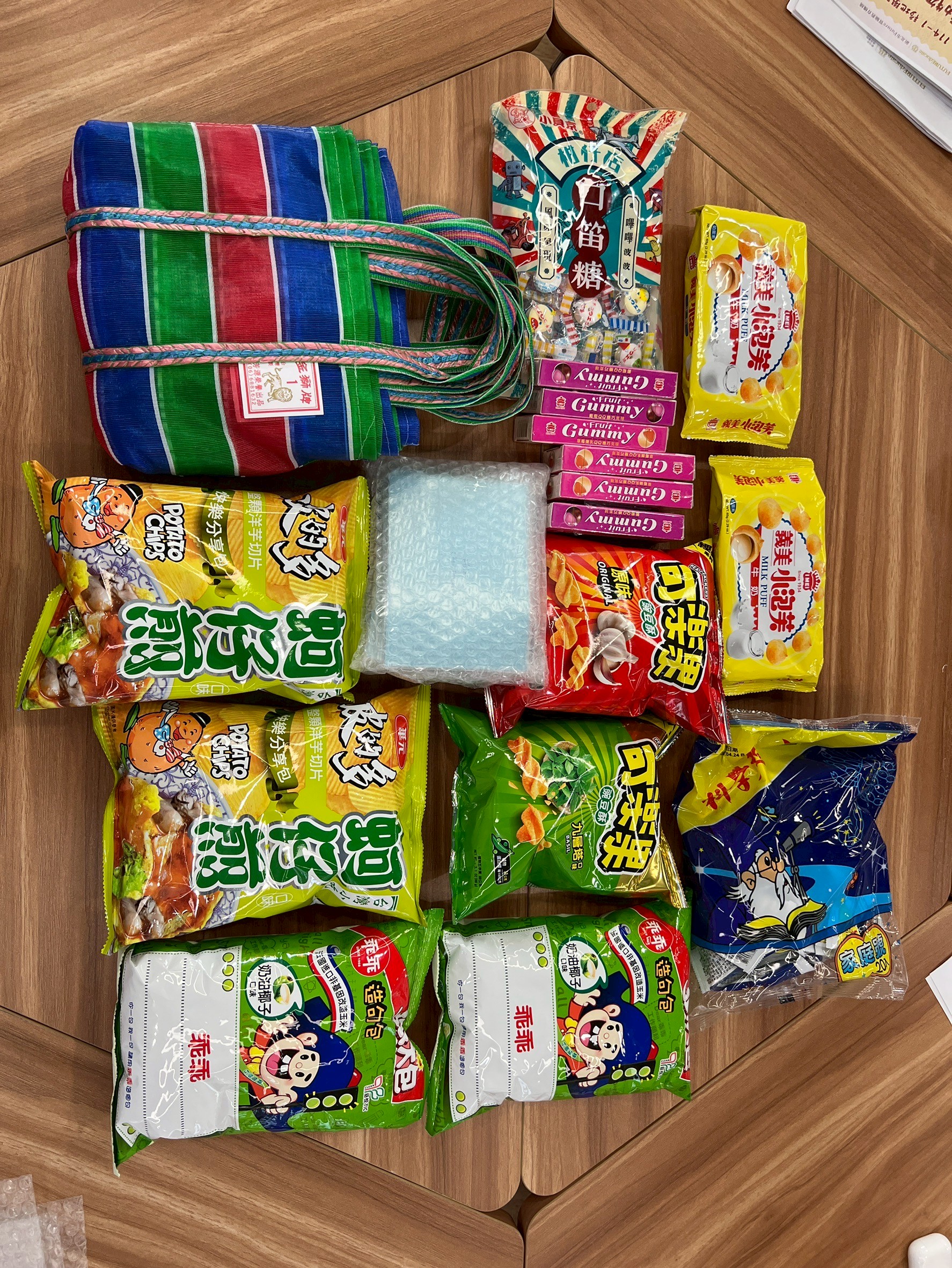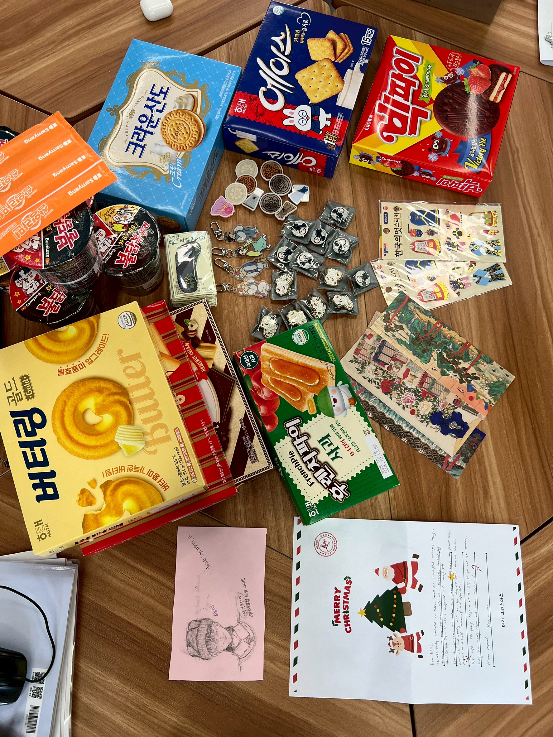 後來我們也收到韓國學校寄來的包裹。滿滿的零食、文化小物、手寫信,還有六碗火雞辣泡麵,超級驚人。