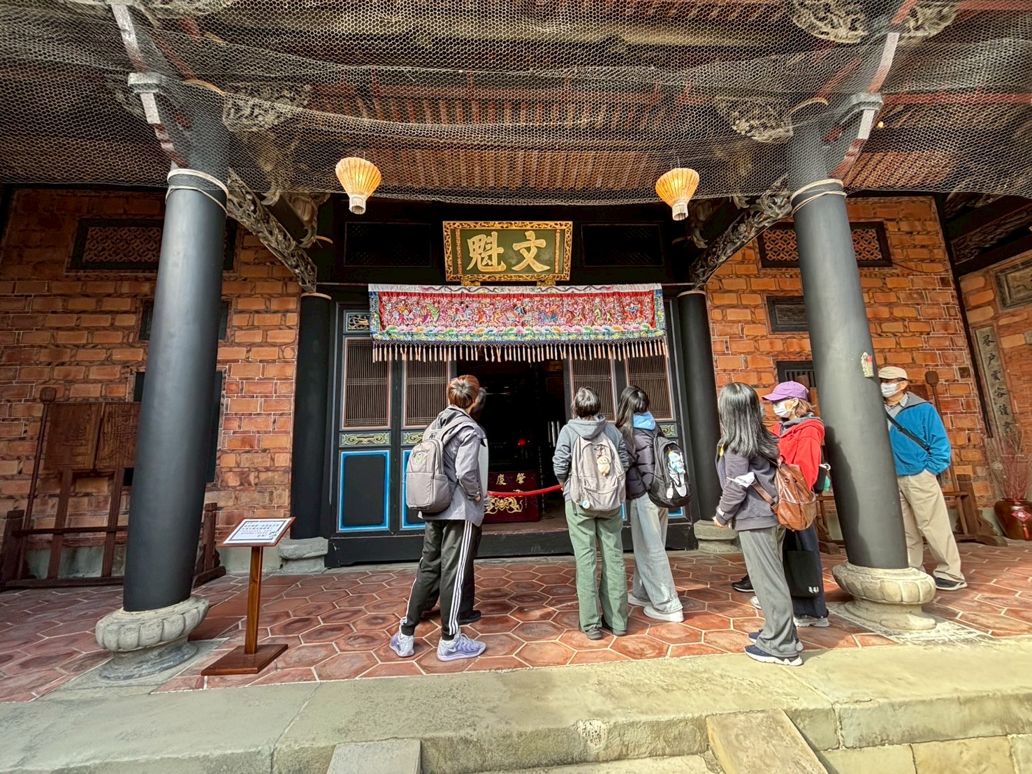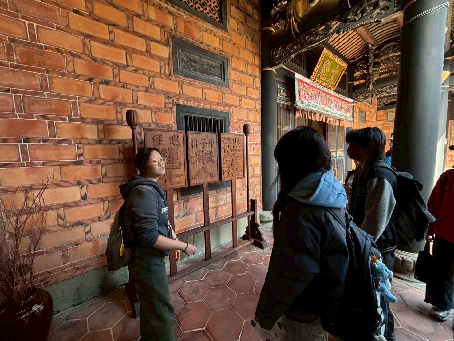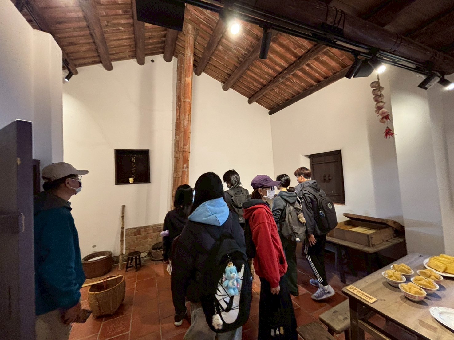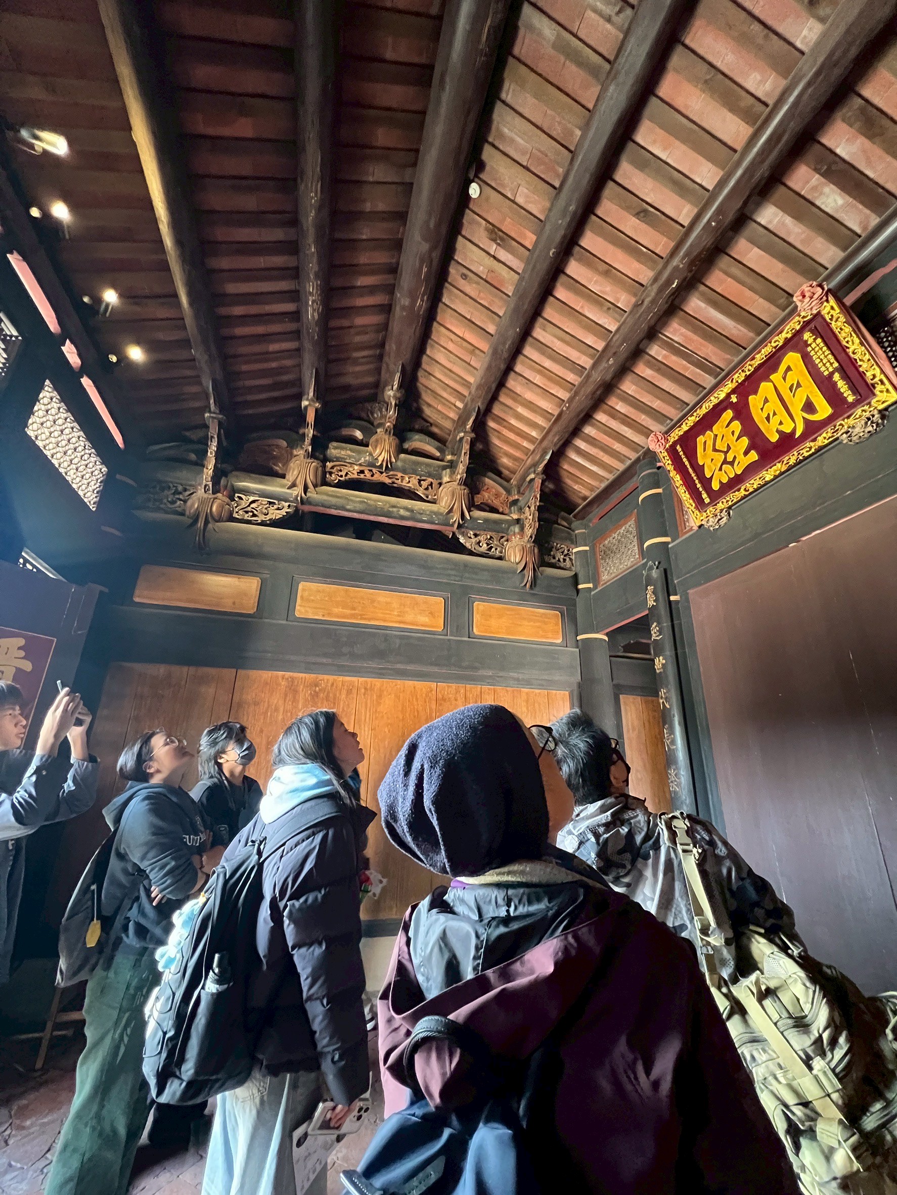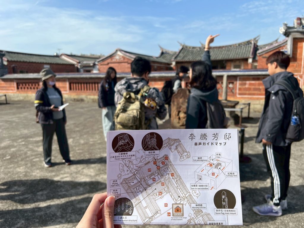 在導覽動線中,我們帶孩子走過書房、父母房、廚房、廳堂……認識旗杆座、匾額、屋脊結構與「三通五瓜」的意義。繞完一圈剛好遇見導覽員,十分感謝她補充了許多在地人才熟悉的故事與觀點,讓孩子的學習更加完整。