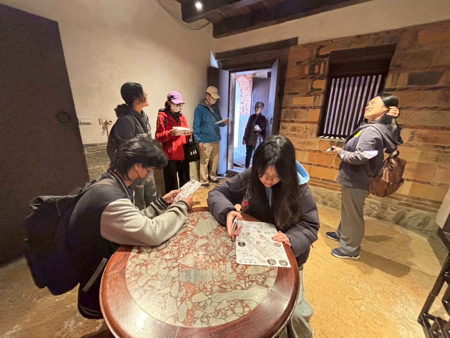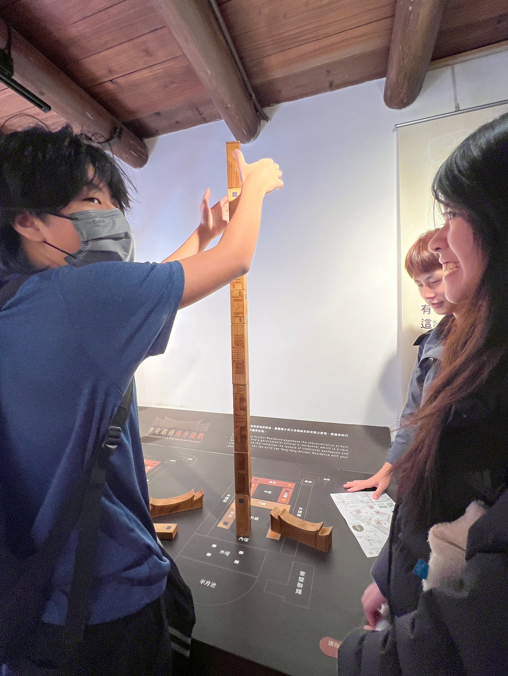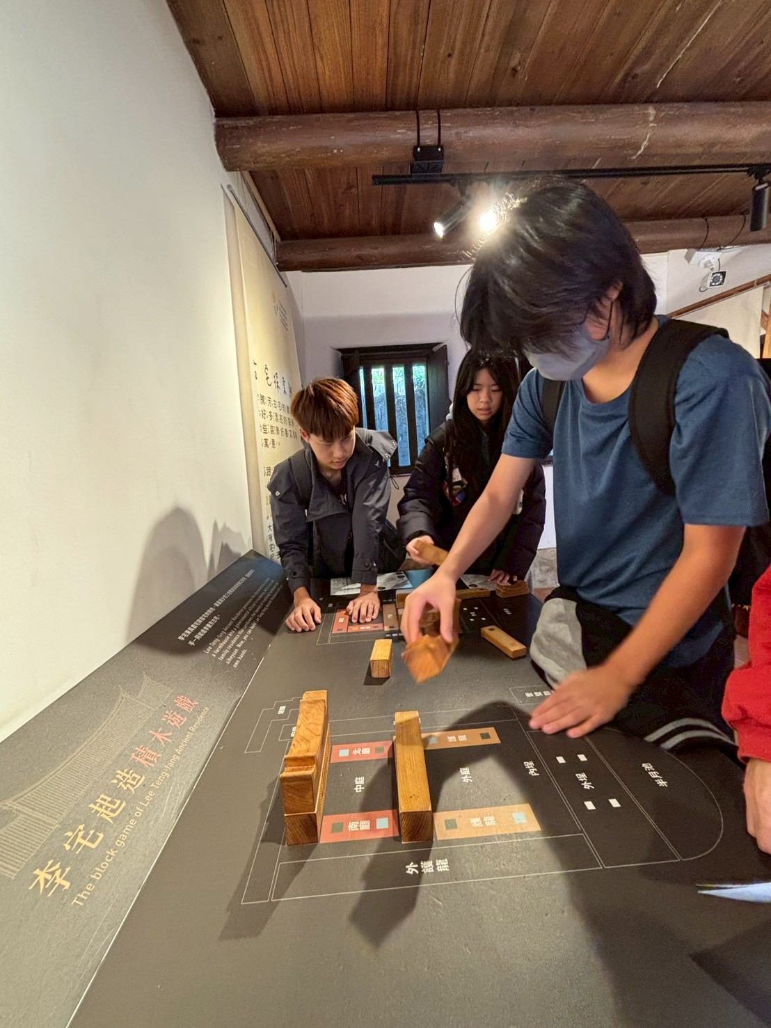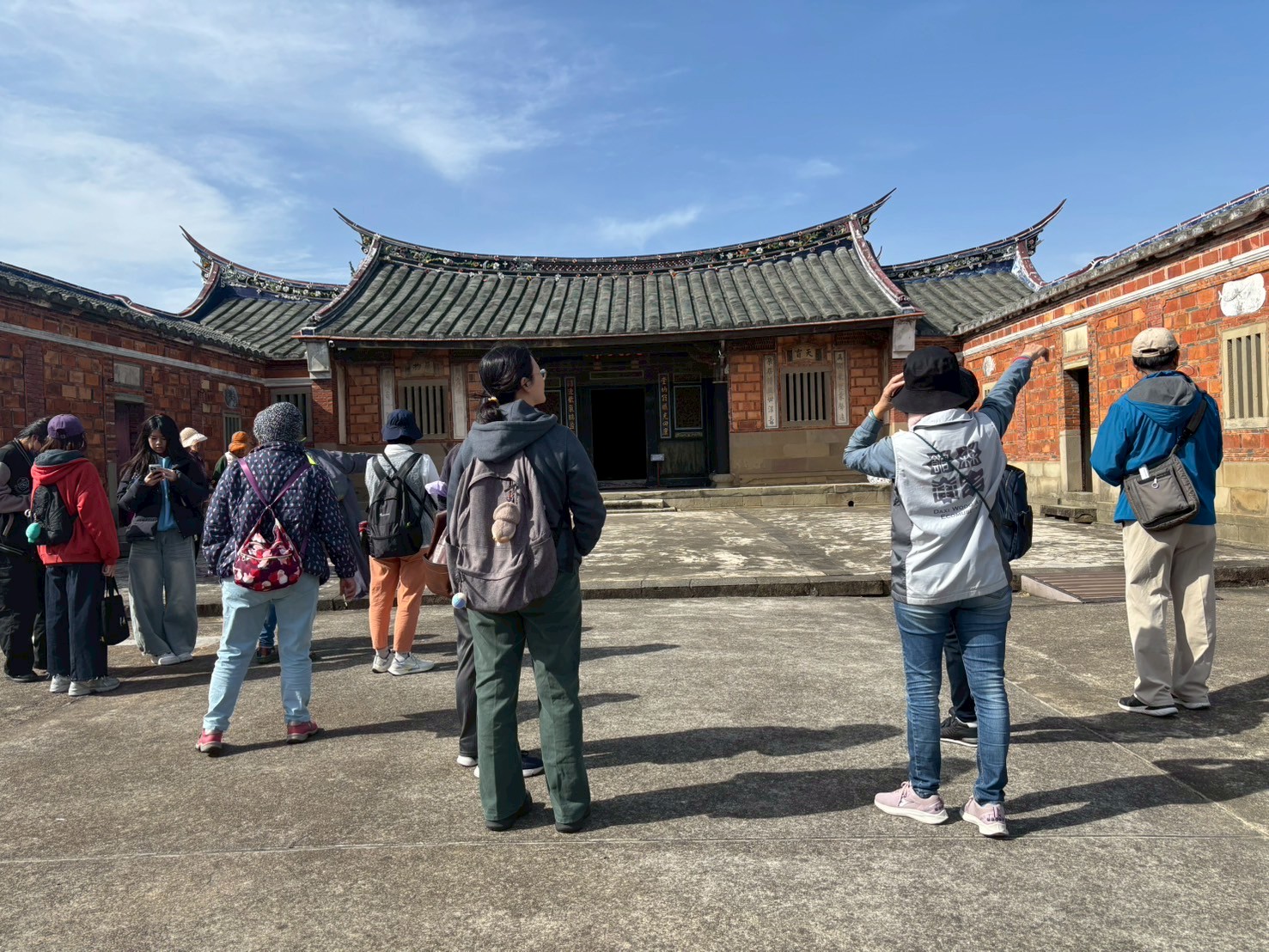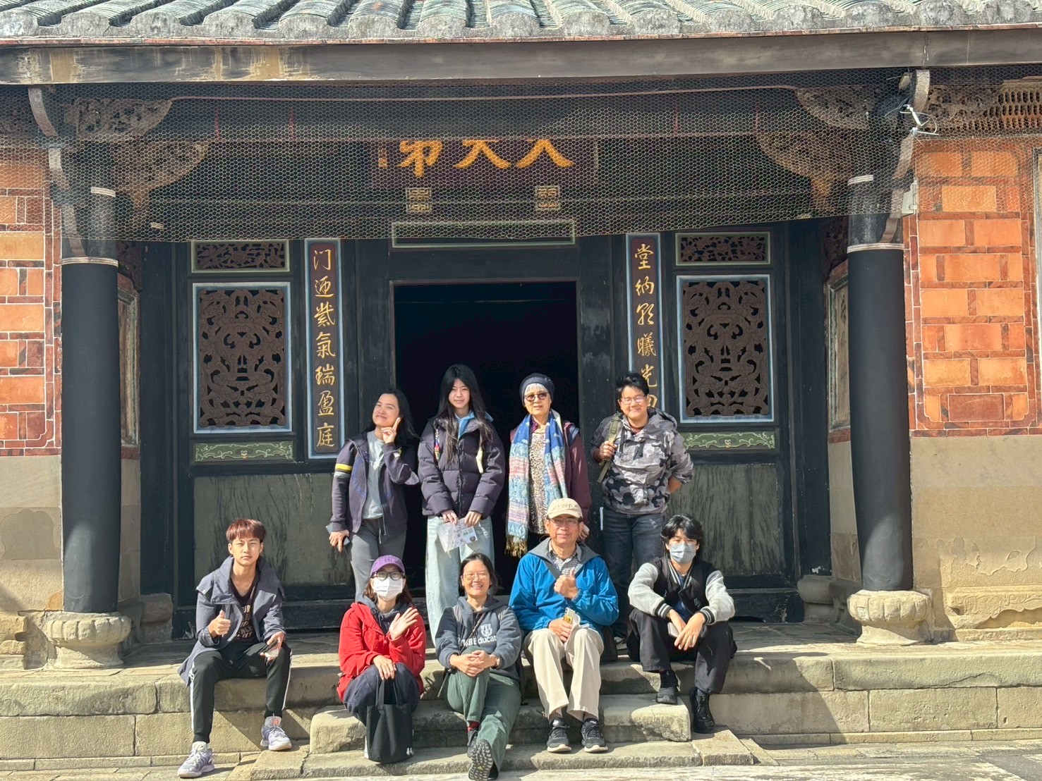 在導覽動線中,我們帶孩子走過書房、父母房、廚房、廳堂……認識旗杆座、匾額、屋脊結構與「三通五瓜」的意義。繞完一圈剛好遇見導覽員,十分感謝她補充了許多在地人才熟悉的故事與觀點,讓孩子的學習更加完整。