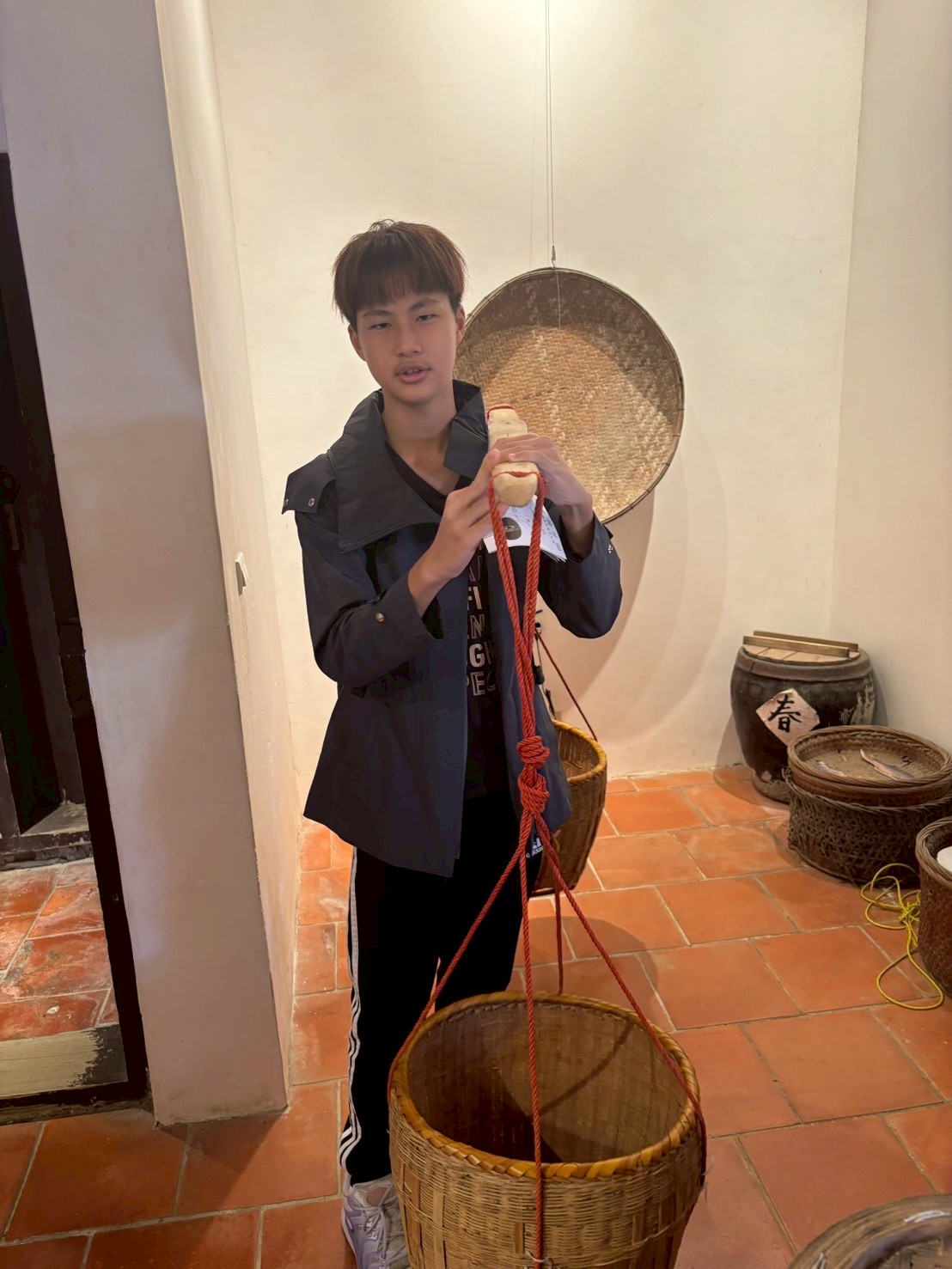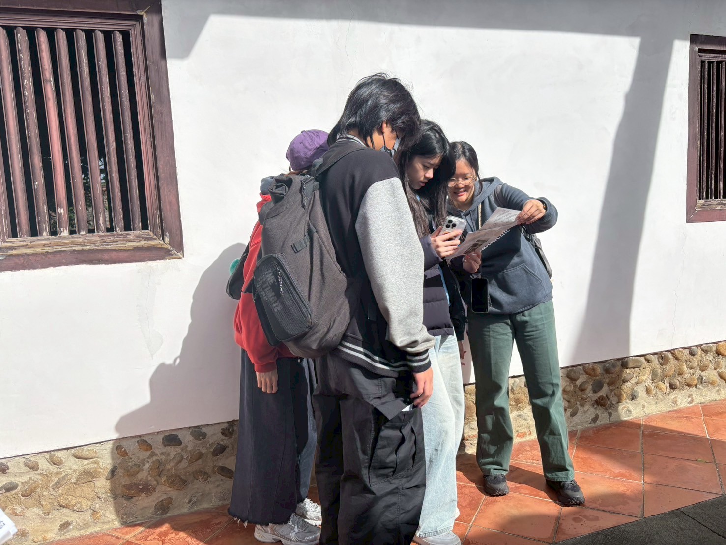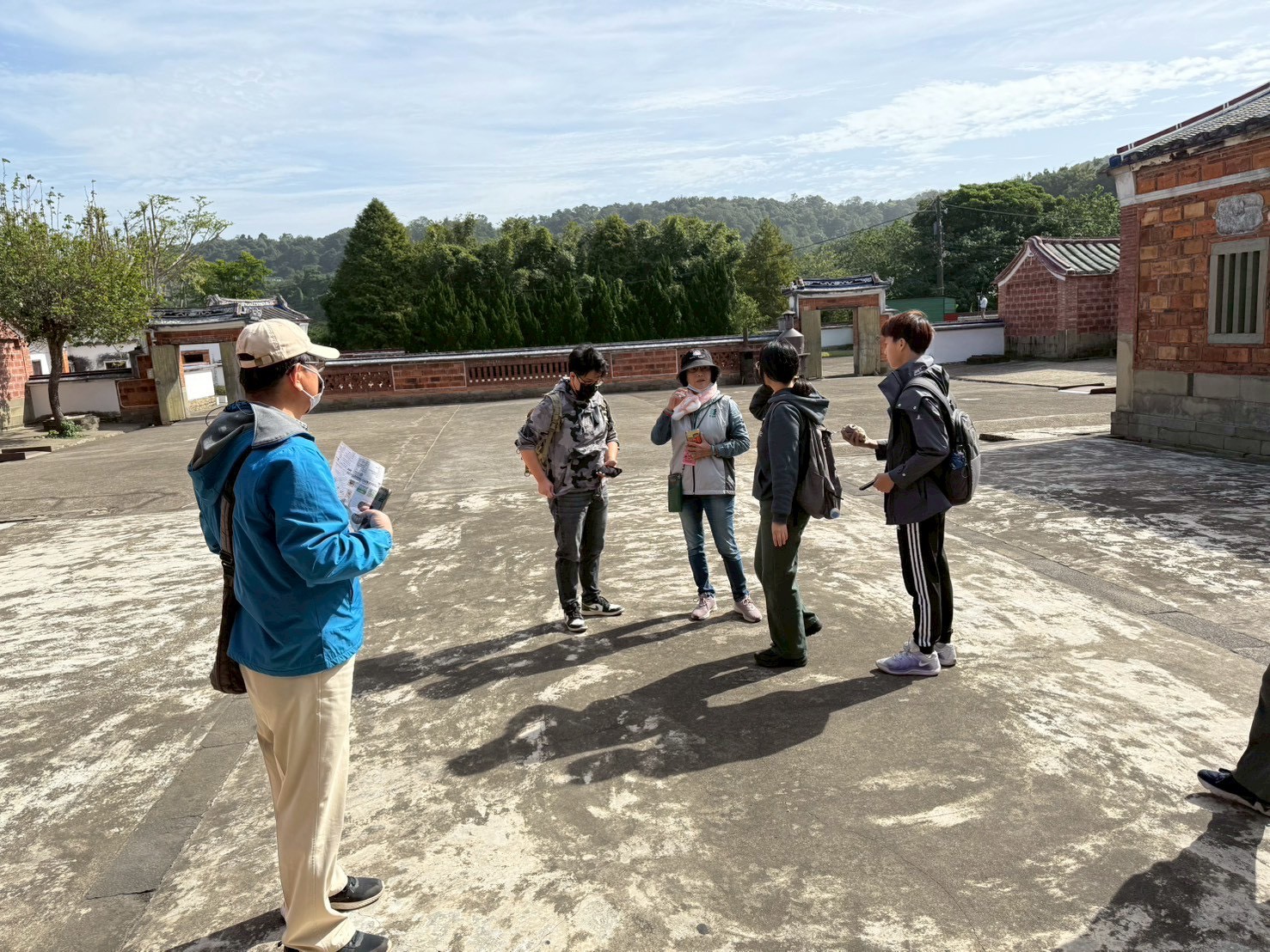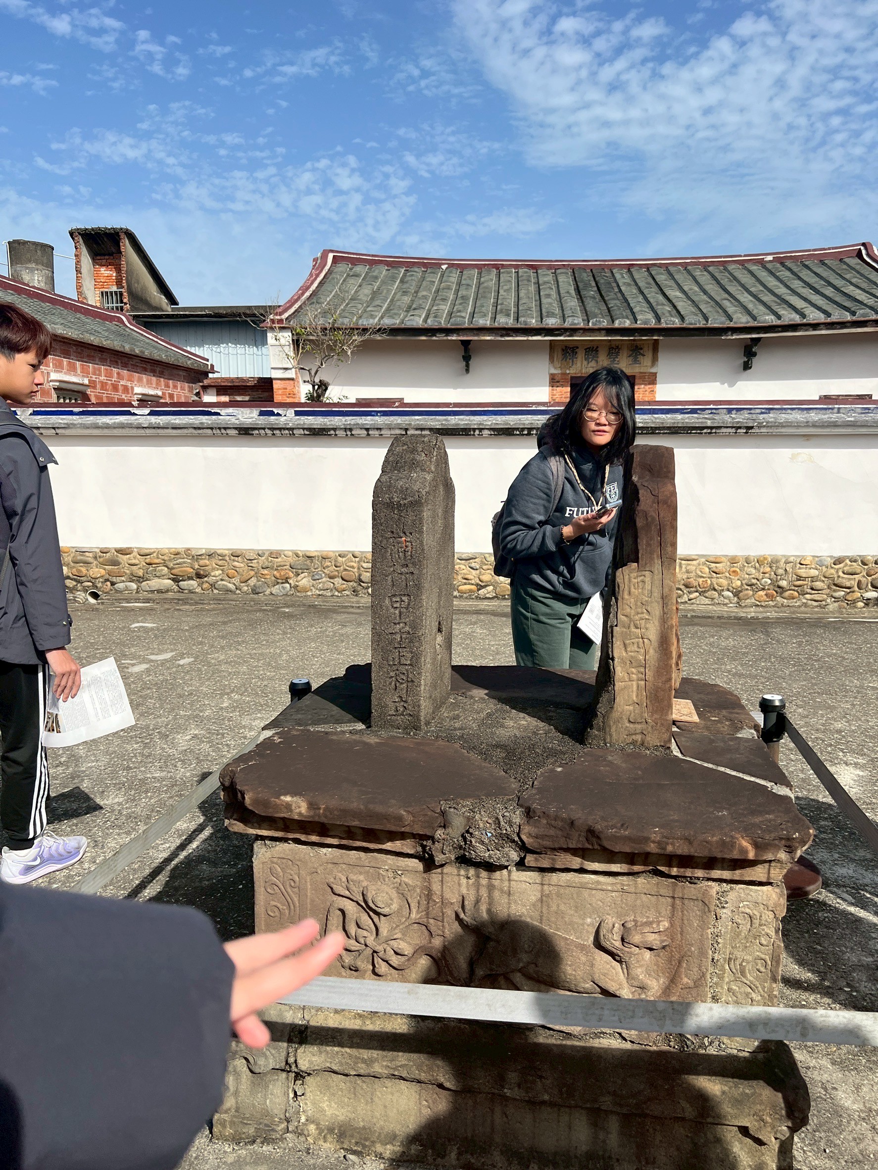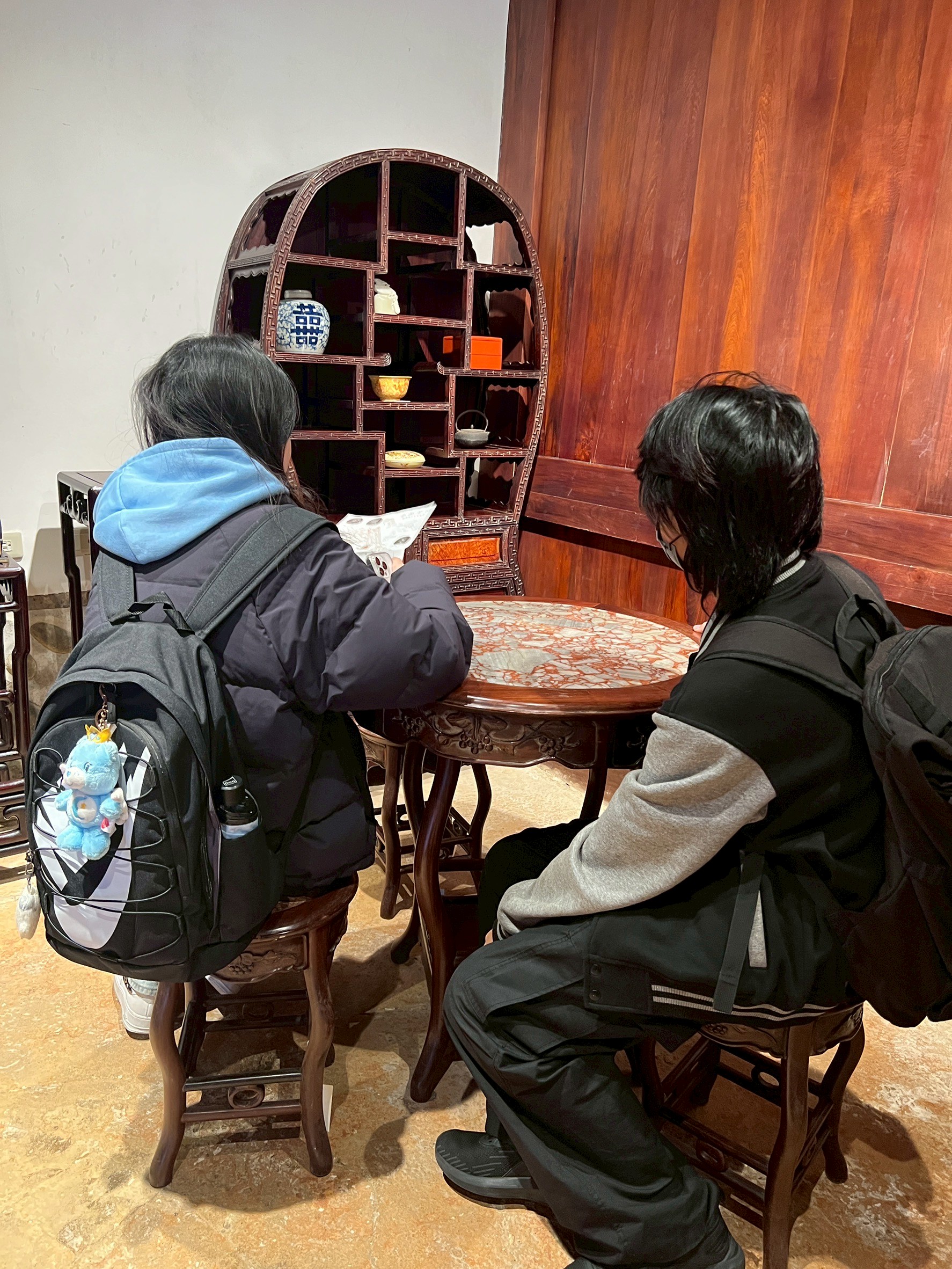 在導覽動線中,我們帶孩子走過書房、父母房、廚房、廳堂……認識旗杆座、匾額、屋脊結構與「三通五瓜」的意義。繞完一圈剛好遇見導覽員,十分感謝她補充了許多在地人才熟悉的故事與觀點,讓孩子的學習更加完整。